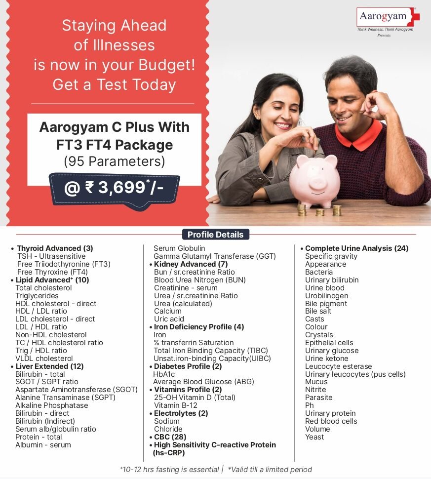 Aarogyam C Plus with FT3 & FT4 Package is a comprehensive preventive health checkup covering 95 parameters. With the inclusion of FT3 and FT4 for advanced thyroid evaluation, the package also covers liver and kidney function, iron levels, diabetes screening, vitamins, electrolytes and a Complete Urine Analysis. It enables early detection of lifestyle disorders, nutritional deficiencies and potential organ-related concerns, making it an ideal choice for individuals seeking a more detailed, proactive, and well-rounded approach to their health monitoring..