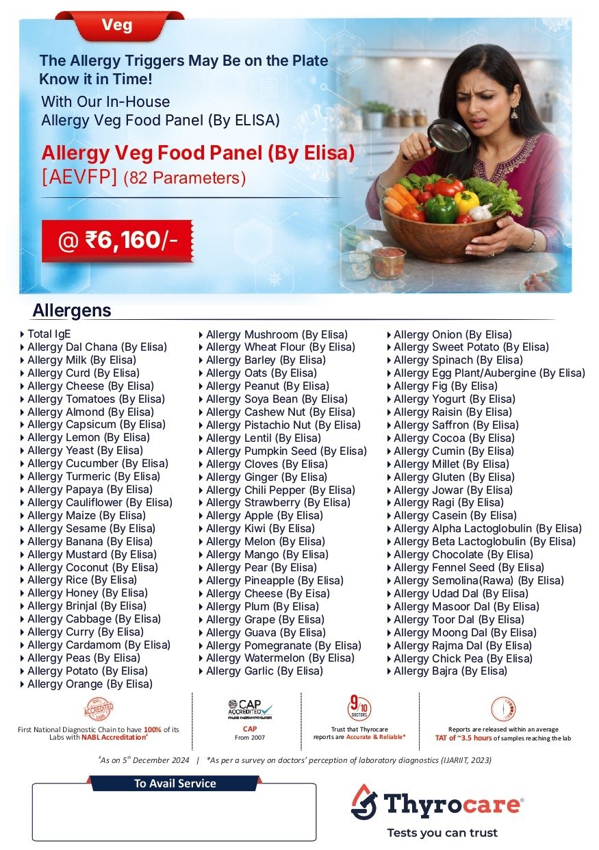 | Usage: | The Allergy Veg Food Panel (By ELISA) including 82 Tests checks whether your body is allergic to a wide range of vegetarian food items by measuring specific IgE antibodies using ELISA technology. This comprehensive panel typically includes cereals, pulses, legumes, vegetables, fruits, nuts and spices commonly consumed in daily diets. Common symptoms may include itching or tingling in the mouth, swelling of the lips, tongue, or throat, skin rashes, hives, facial swelling, abdominal pain, bloating, nausea, vomiting, diarrhea, nasal congestion, sneezing, wheezing, breathing difficulty, or worsening of asthma symptoms after consuming specific vegetarian foods. |