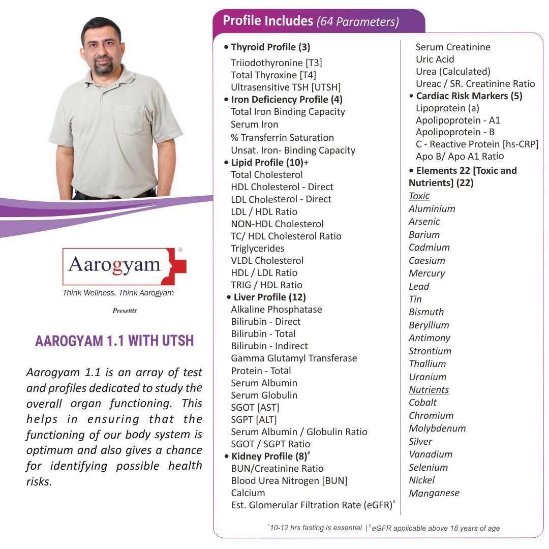 | Usage: | Aarogyam 1.1 is a good choice for the person who wishes to get a whole body check up at affordable price. This package involves test and profiles which are dedicated to study the overall functioning of your body. It includes profile which aids to assess functioning of organs and undertake timely action against abnormalities. Tests included in this package(63 Tests) |