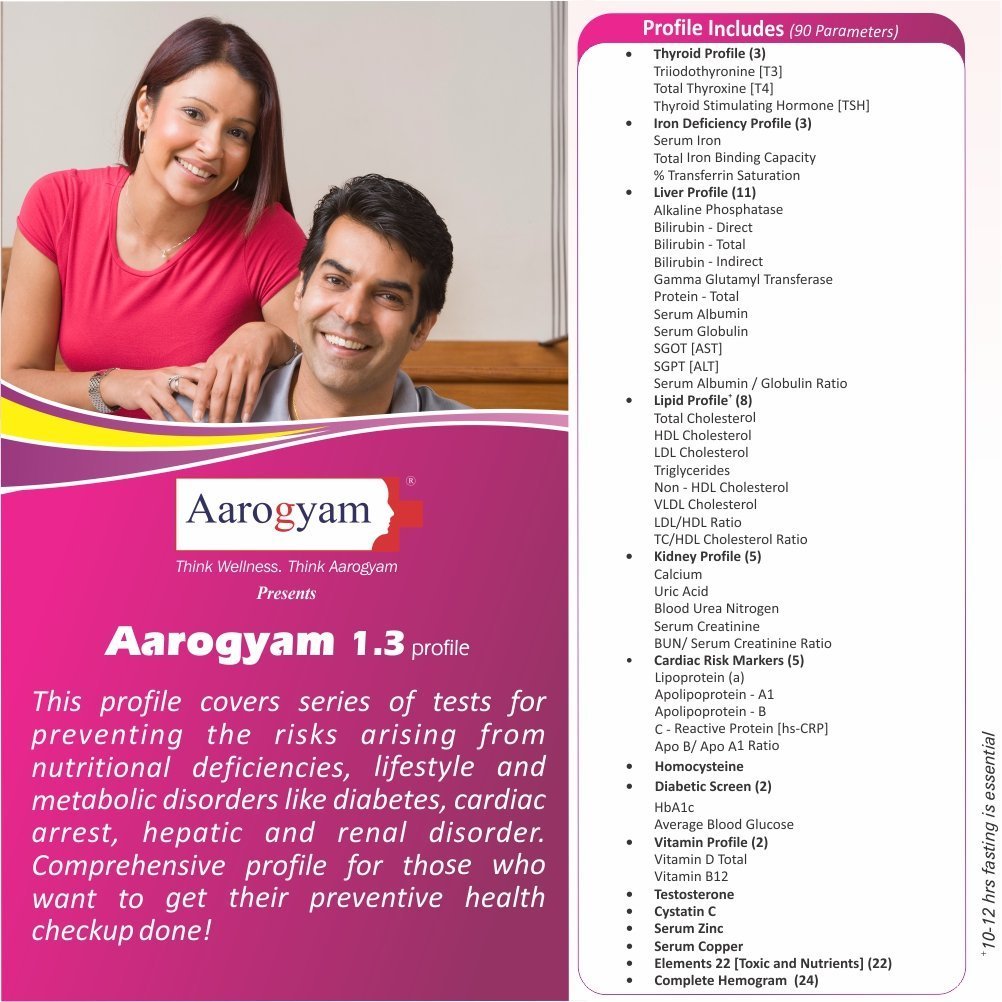 | Usage: | Aarogyam 1.3 profile offers 97 parameters that include 22 Toxic Elements and Nutrients, Vitamin D & Vitamin B12 and Cardiac risk makers to evaluate risk of heart diseases. |