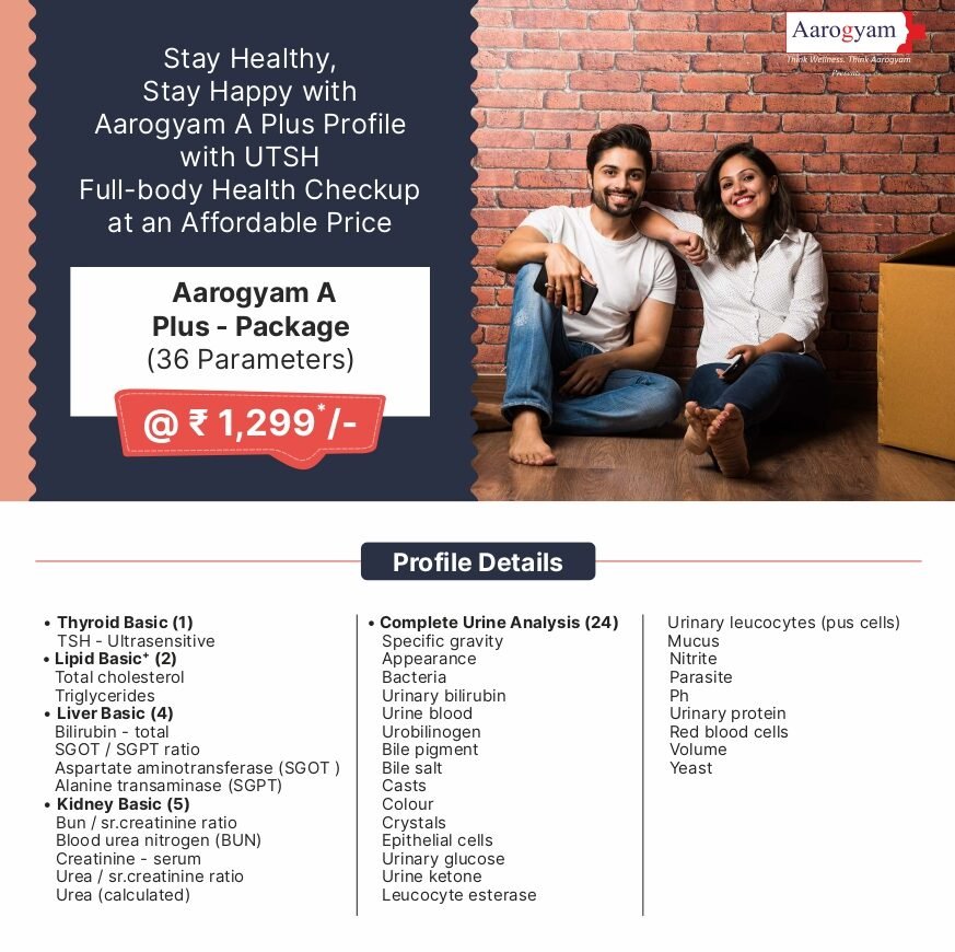 | Usage: | Aarogyam A Plus – Package is a smart preventive health checkup that includes 36 essential parameters, covering key profiles such as Thyroid, Lipid, Liver, and Kidney, along with a Complete Urine Analysis for a more comprehensive health assessment. It helps evaluate the functioning of the thyroid gland and vital organs like the liver and kidneys, while also providing insights into urinary health. |