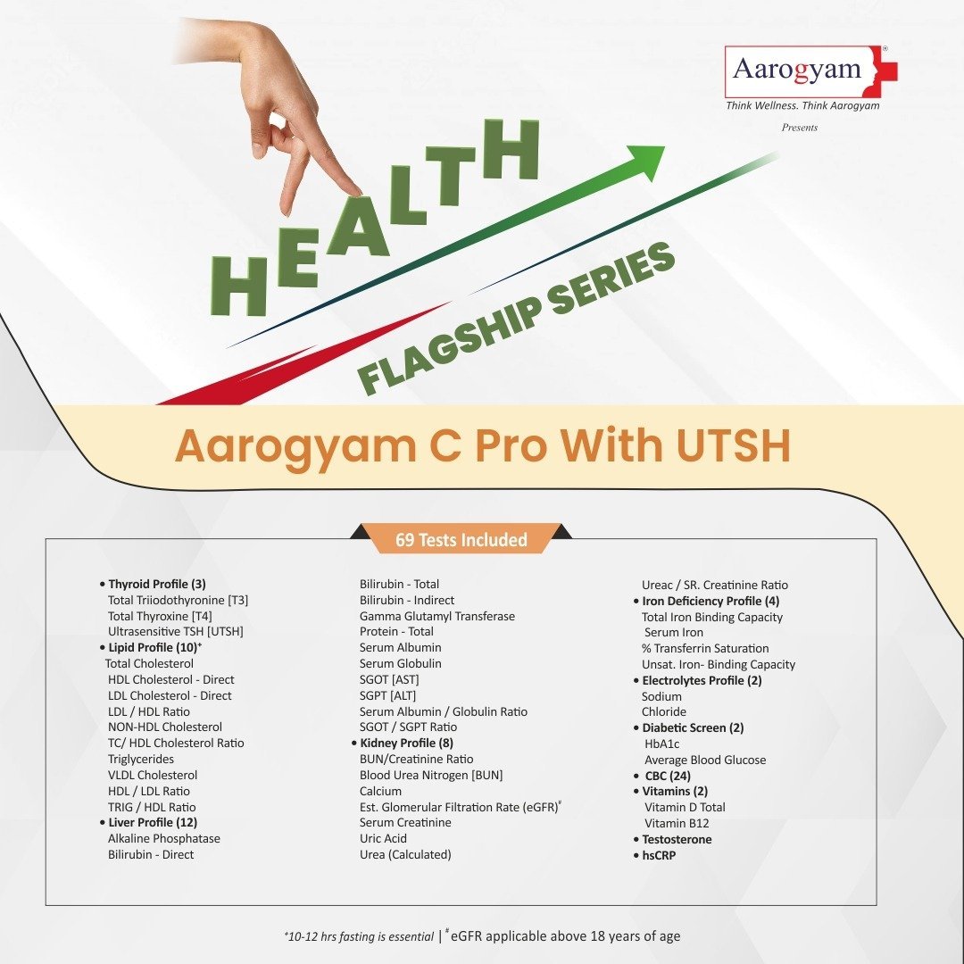 Usage: Aarogyam C Pro with UTSH is our best-selling health checkup package containing 69 parameters . The highlight of this package is inclusion of Vitamin D & Vitamin B12 at extremely affordable cost making it the most popular package on our menu containing all crucial tests like thyroid, liver, lipid, kidney, diabetes, iron deficiency, CBC along with vitamins, electroloytes & high sensitivity c-reactive protein test yet extremely pocket friendly. The best all- round package that helps identify health issues early and allow timely treatment.
