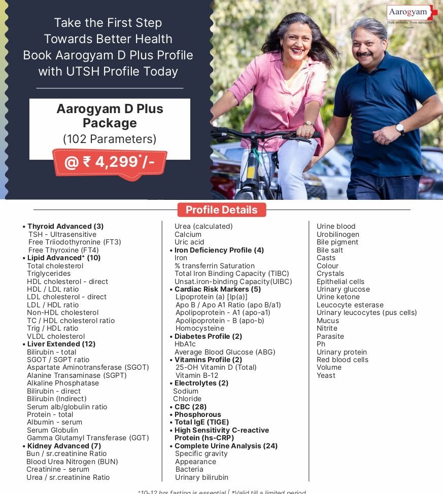 | Usage: | Aarogyam D Plus Package is an advanced preventive health checkup covering 102 parameters, designed for a deeper and more comprehensive evaluation of your overall health. It includes detailed assessment of thyroid function, liver and kidney health, iron levels, cardiac risk markers, diabetes, vitamins, electrolytes, along with Complete Urine Analysis. This package supports early detection of heart risks, lifestyle disorders, nutritional deficiencies and organ-related concerns, making it ideal for individuals seeking thorough and proactive health monitoring. |