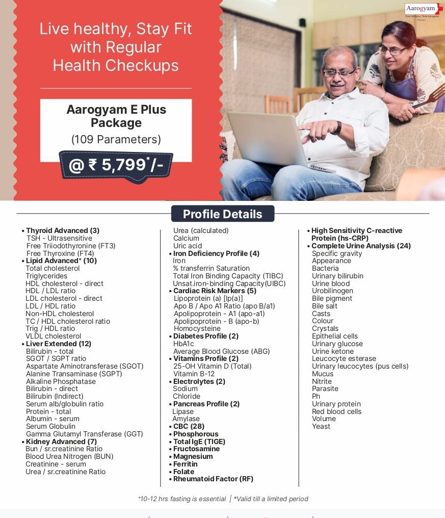 Usage: Aarogyam E Plus Package is a comprehensive preventive health checkup covering 109 parameters, designed to provide a detailed assessment of your overall well-being. It includes advanced evaluation of thyroid function, liver and kidney health, cardiac risk markers, diabetes, iron levels, vitamins, electrolytes, pancreas function, CBC, along with Complete Urine Analysis. This package also helps screen for nutritional deficiencies, arthritis, and metabolic disorders, enabling early detection of lifestyle diseases and organ-related issues.