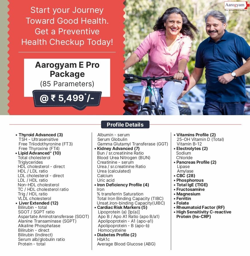 Usage: Aarogyam E Pro Package is a comprehensive health checkup package designed to give a detailed assessment of your overall well-being by covering 85 vital health parameters. It includes advanced evaluation of thyroid function, liver and kidney health, heart risk markers, diabetes, iron levels, vitamins, electrolytes, and pancreas function, along with other tests. It also screens for nutritional deficiencies and conditions like arthritis and metabolic disorders, helping in the early detection of lifestyle diseases and organ-related issues.
