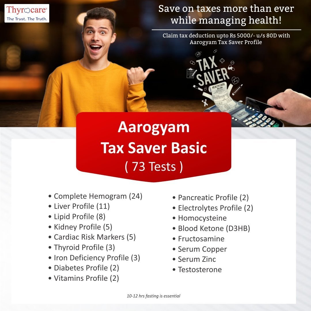 Aarogyam Tax Saver – Basic with UTSH is a preventive care package that helps a person keep track of his health while saving on taxes, as with preventive care check up you can Claim tax deduction upto Rs. 5000 under section 80D. Package consists of 80 tests which include, complete hemogram, checking the functioning of the liver, kidney, heart and pancreas. It also includes tests for thyroid, iron deficiency, diabetes, vitamins, electrolytes, homocysteine, blood ketone, fructosamine, copper, zinc and testosterone. A holistic health care package that is light on the pockets and beneficial for one’s health.